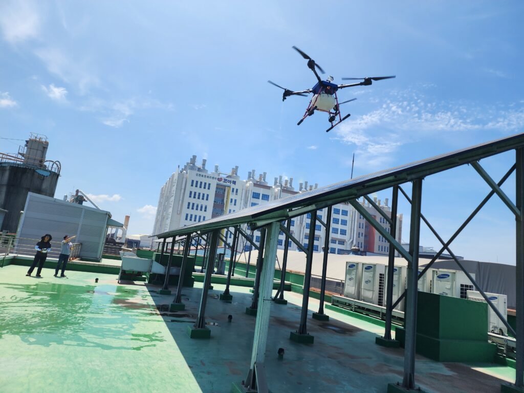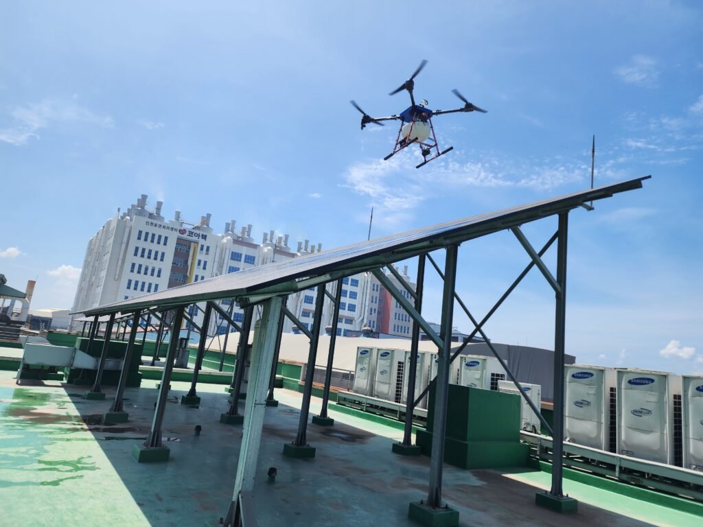 도시 건물 옥상 태양광 판넬 불량 유무 점검.